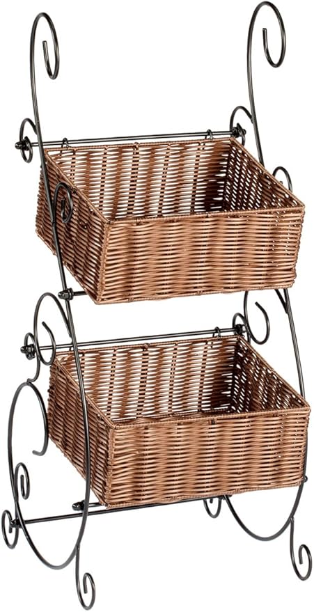 Black Metal Countertop 2 Tier Basket Stand With 2 Brown Wicker