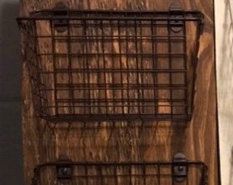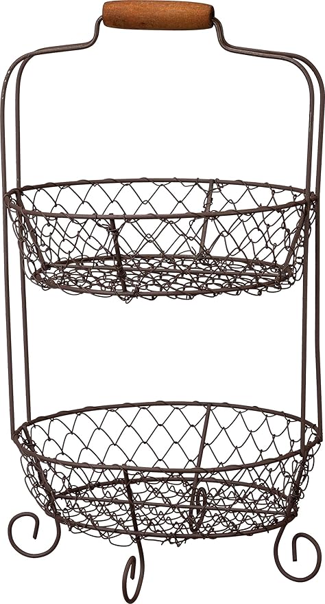 Rustic Vintage Kitchen 2 Tier Wired Caddy Fruit Basket Wood Handle