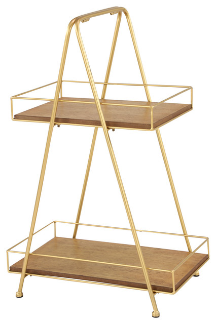 Tall Gold And Wood 2 Tier Rectangular Serving Tray Stand