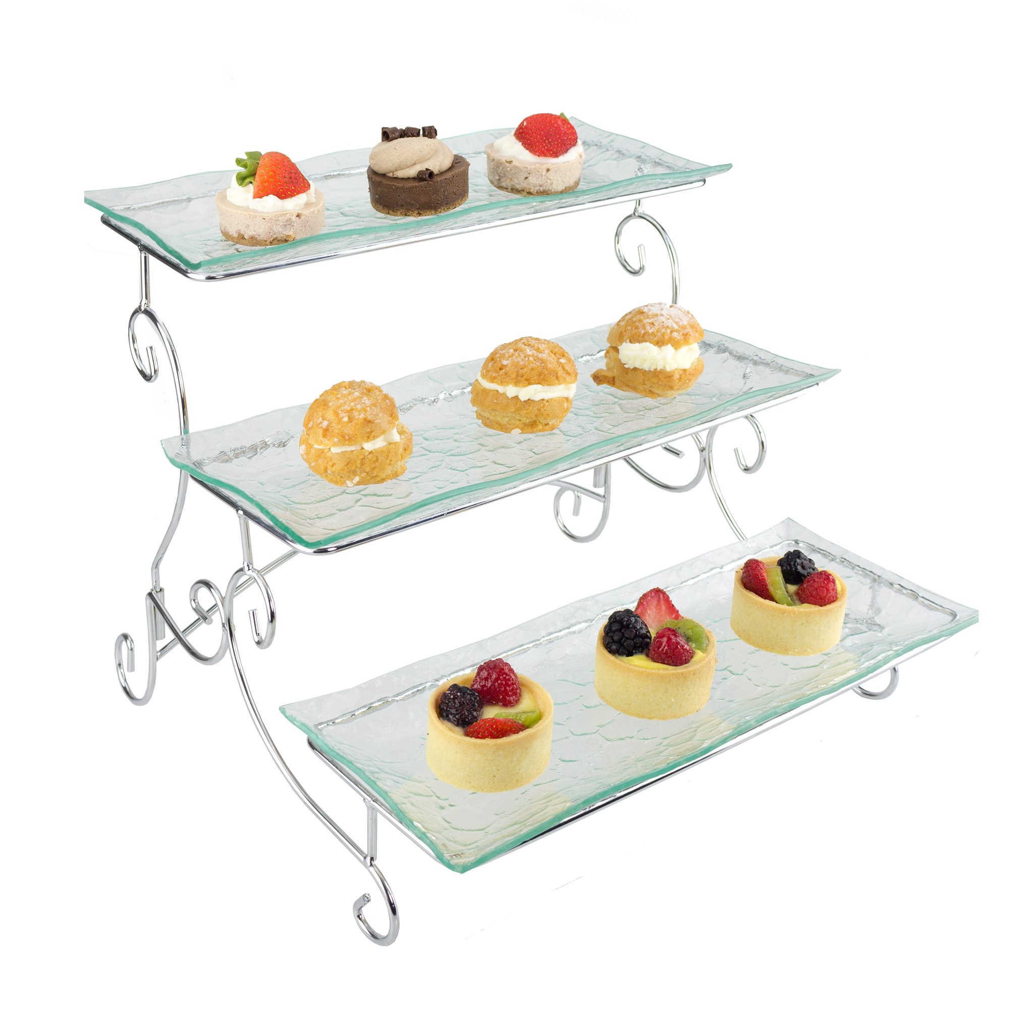3 Tier Server Glass Tiered Tray With Silver Finish Metal Stand