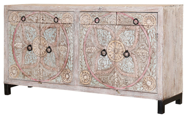 Turquoise Trail Frosted White Hand Carved 4 Drawer Large Sideboard