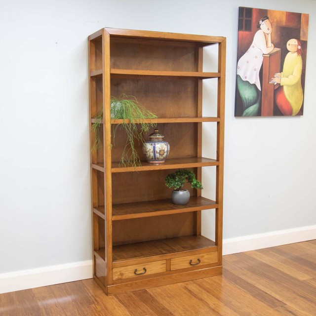 Retro Vintage Elm Timber 5 Tier Bookcase Bookshelf 2 Drawers