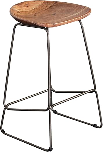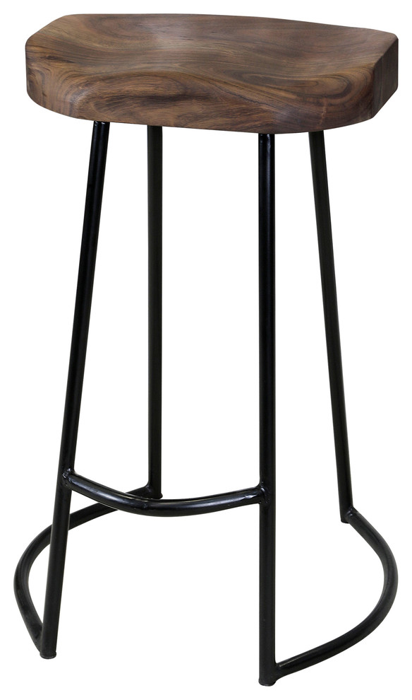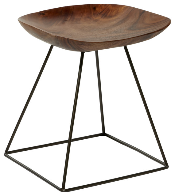 Natural Brown Acacia Wood Stool With Scoop Seat And Black Iron Geometric Base Industrial Bar Stools And Counter Stools By Brimfield May