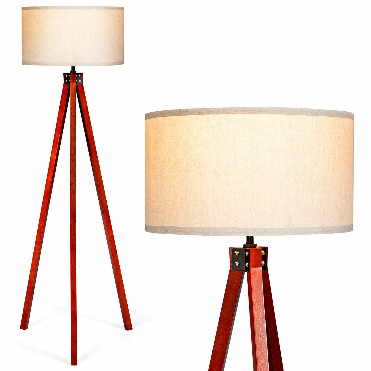 Gymax Modern Wood Tripod Floor Lamp Flaxen Lamp Shade W Foot