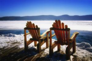 Two Adirondack Chair On A Dock At Spencer Pond In Northern Maine