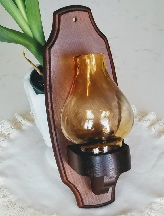 Vintage Wooden And Amber Glass Wall Sconces Wall Mount Candle Etsy