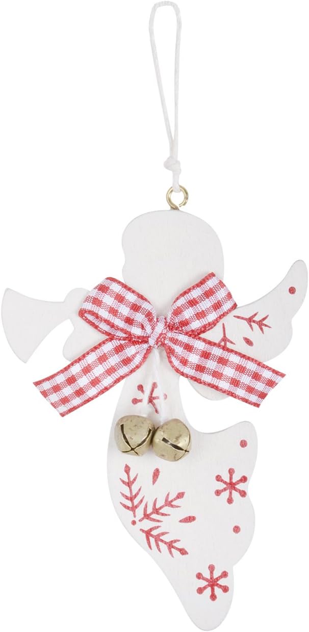 Mr Crimbo Set Of 6 Wooden Angel Christmas Tree Decorations 10cm Hanging Jingle Bells Red Ribbon Hand Painted