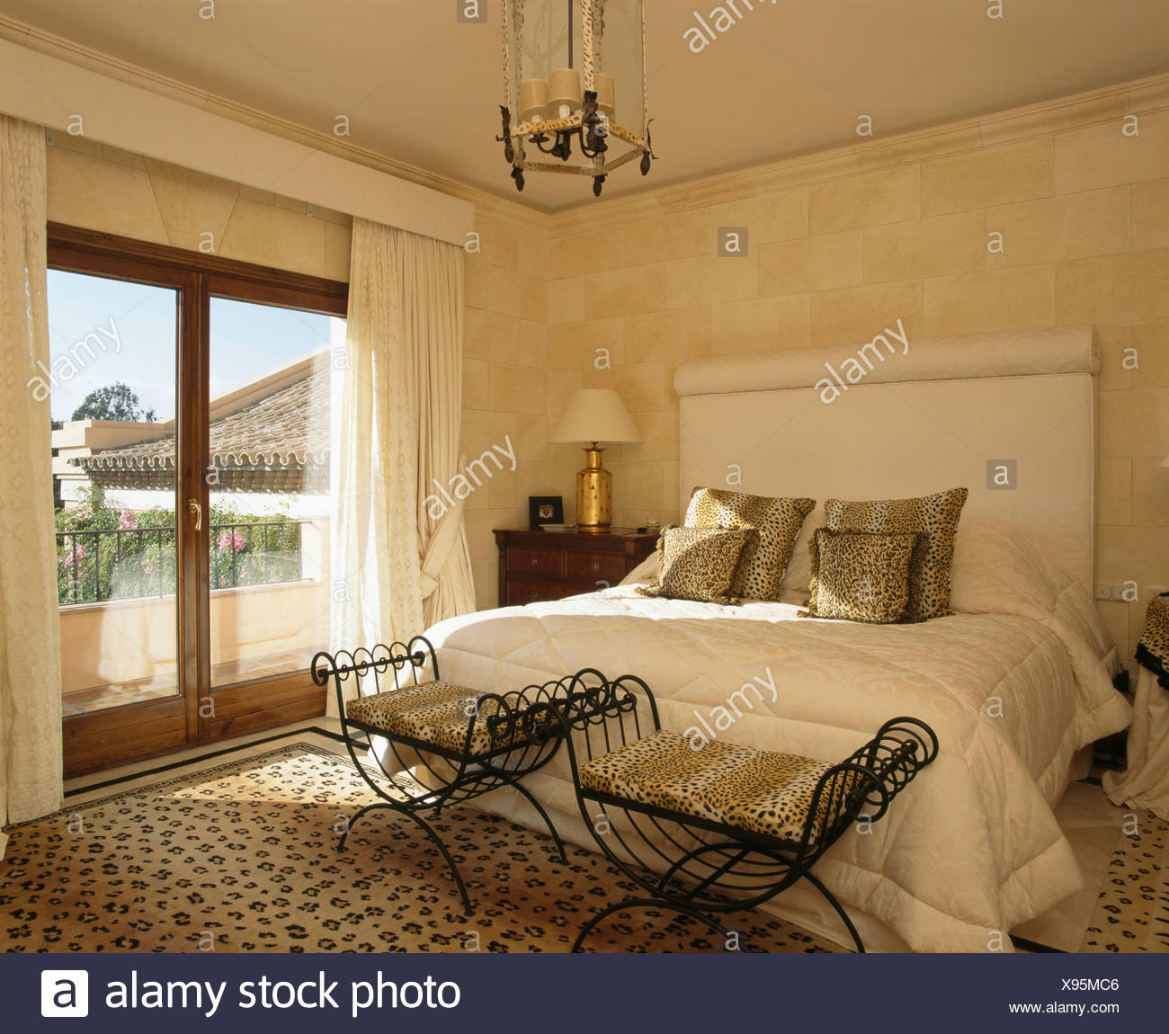 Wrought Iron Stools Below Bed With Animal Print Cushions In Modern