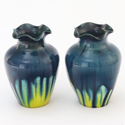 Small Antique Blue And Yellow Drip Glaze Vases From Linthorpe