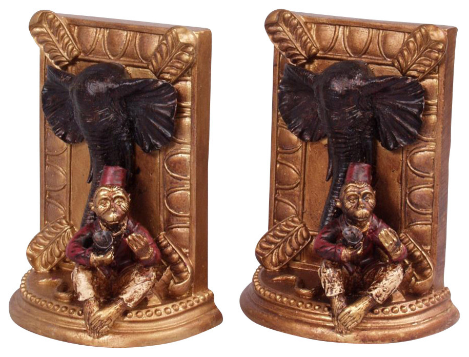 Monkey Elephant Bookends Pair In Antique Gold Tone Finish