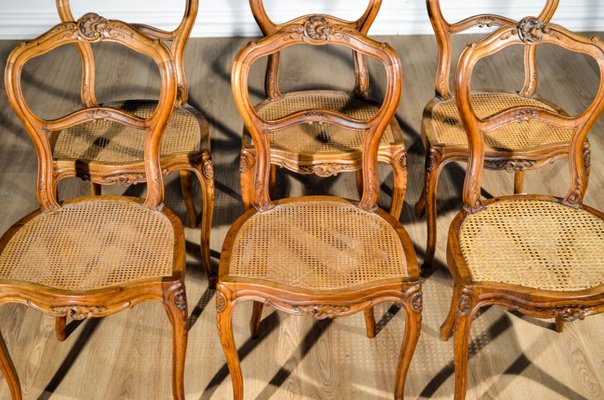 Set Of Six Antique French Style Wood Dining Chairs With Cane Seats
