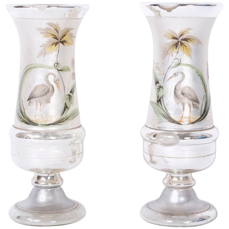 Pair Of Antique Hand Painted Mercury Glass Vases Item 1026823