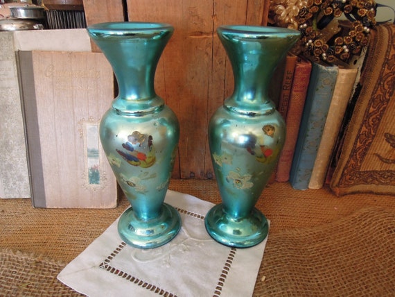 Vintage Teal Blue Pair Mercury Glass Vases Antique Hand Etsy