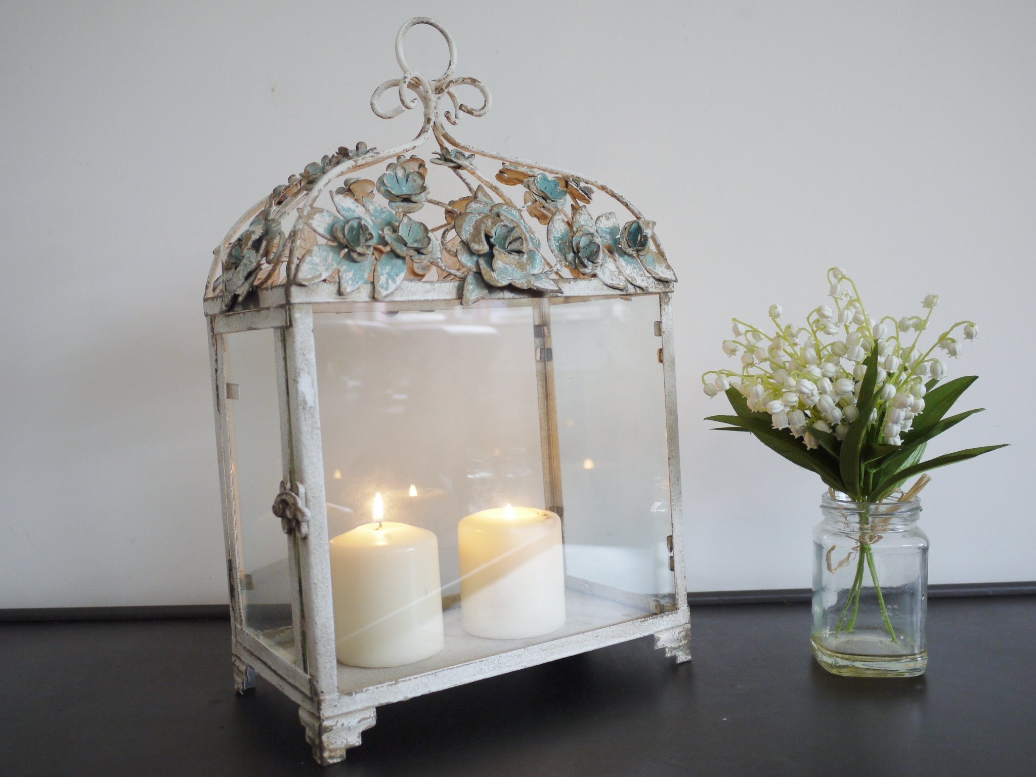 Vintage French Shabby Chic Blue Flower Antique White Lantern
