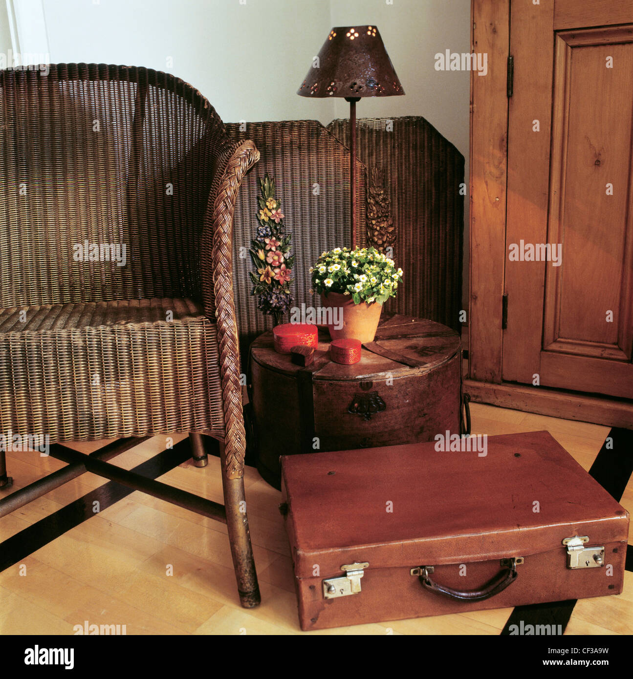 Real Homesdetail Of Living Area With Wicker Chair Antique Suitcase Stock Photo 43714549 Alamy