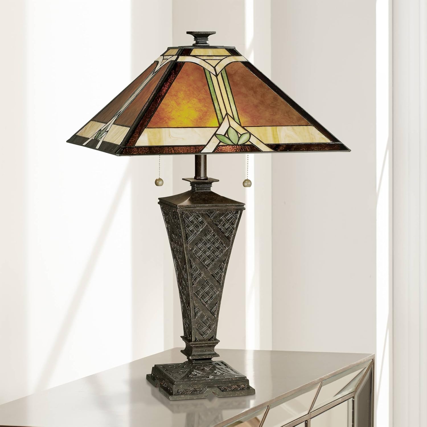 Mission Table Lamp Bronze Wicker Pattern Antique Stained Art Glass Shade For Living Room Family Bedroom Bedside Robert Louis Tiffany Amazon Com