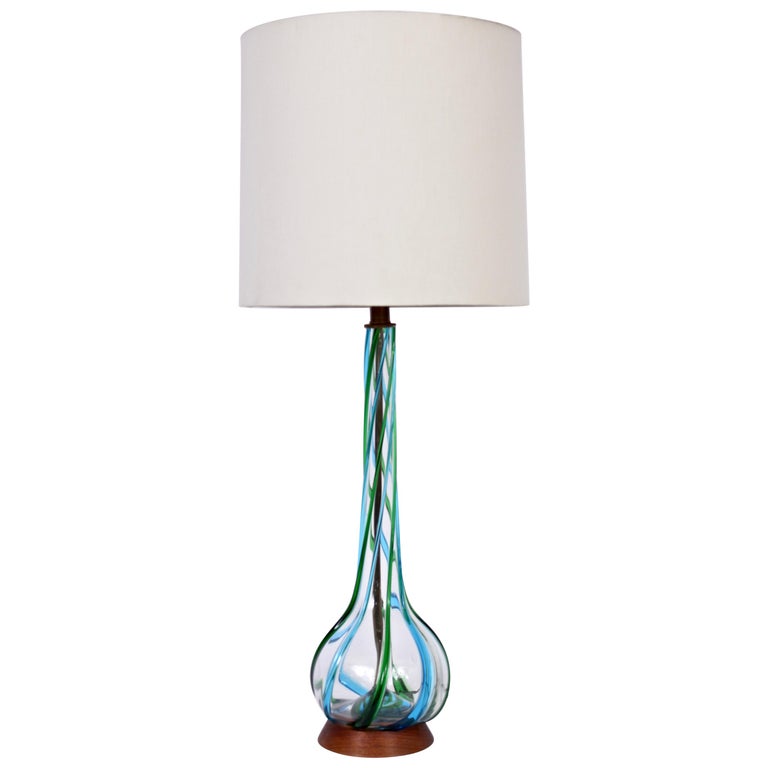 Tall Hand Blown Clear Murano Art Glass Lamp With Aqua And Green