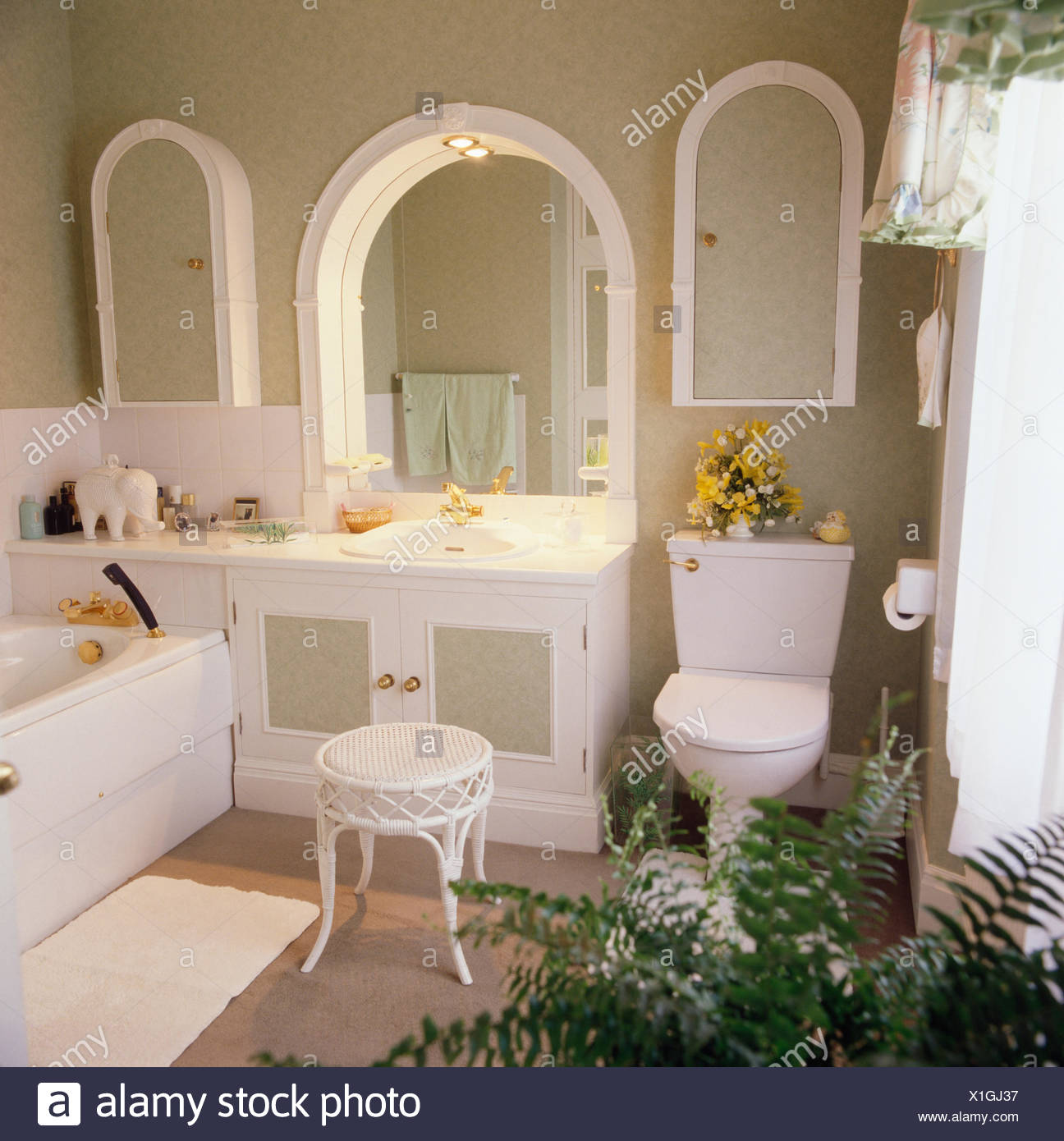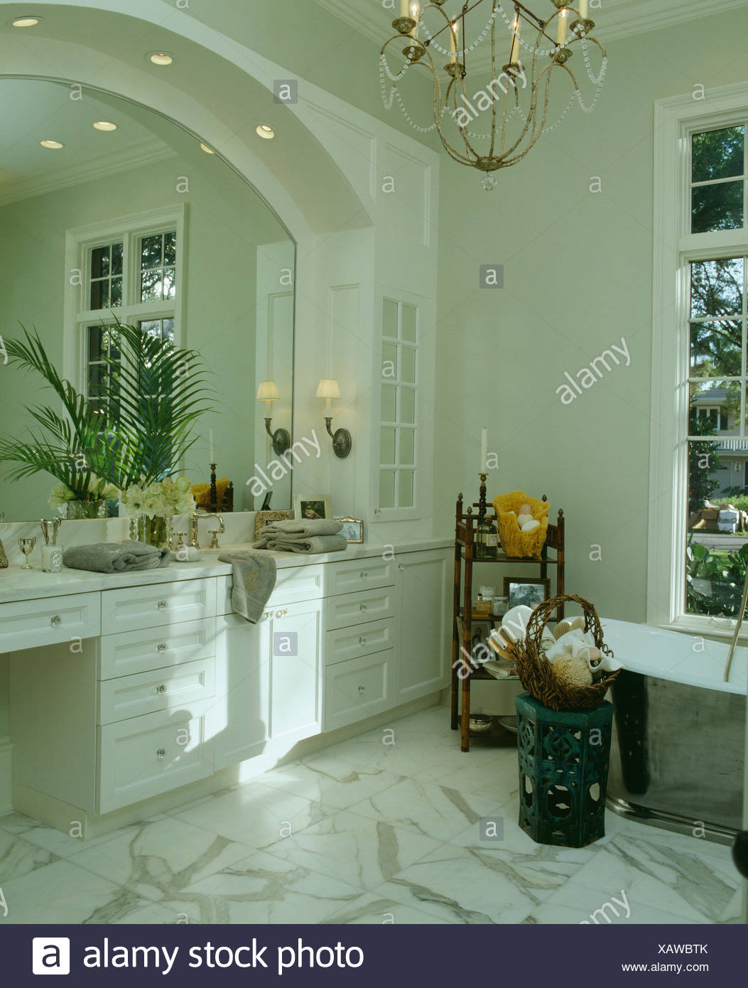 Large Arched Mirror Above Vanity Unit In Traditional Bathroom With Small Freestanding Storage Unit Stock Photo Alamy