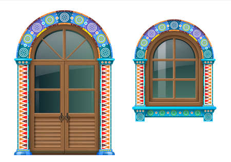 Arched Wooden Doors And Window In Mexican Or Spanish Style With