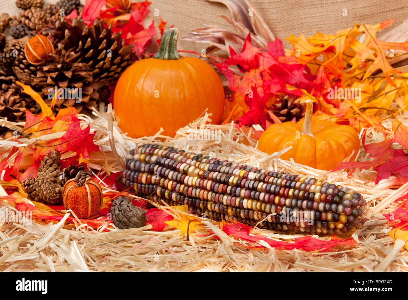 An Autumn Holiday Theme With Pumpkins Corn Pine Cones And Autumn