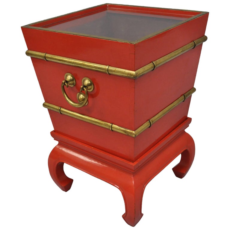 Chinoiserie Red Lacquer Oriental Pedestal Planter Accent Table Brass Faux Bamboo For Sale At 1stdibs