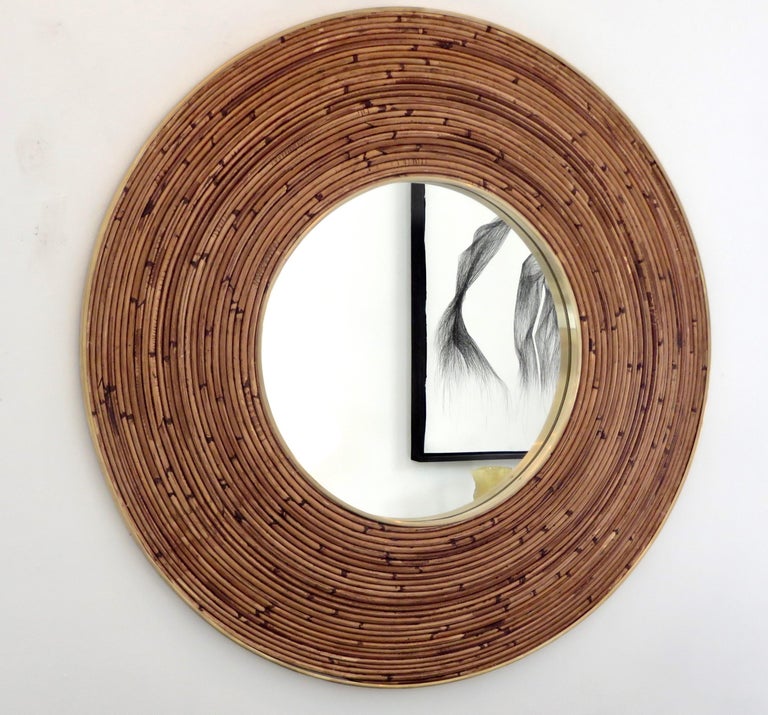 Round Italian Rattan Bamboo And Brass Framed Mirror Circa 1970 For