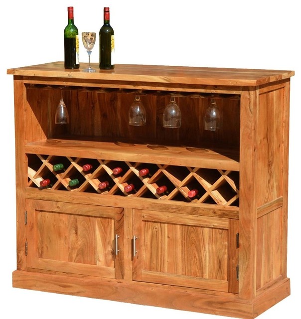 Modern Rustic Acacia Wood Wine Bar Cabinet W Glass Stem Rack