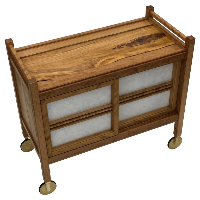 Bar Cart In Cherry With Brass Casters And Shoji Sliding Doors For